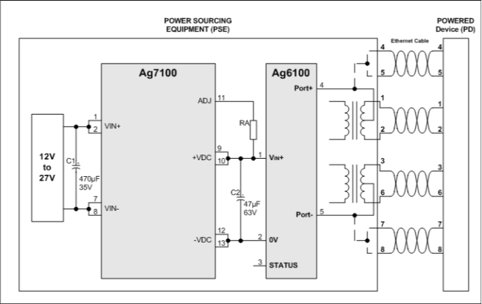 Ag7100 provides a cost and footprint optimised 40W isolated DC-DC converter, to boost 12V/24V up to 48V/57V. It is perfect for PoE, PSE or other applications requiring a convenient solution with minimal additional components and easy integration. It is an ideal functional complement to the Ag6100 PSE module.